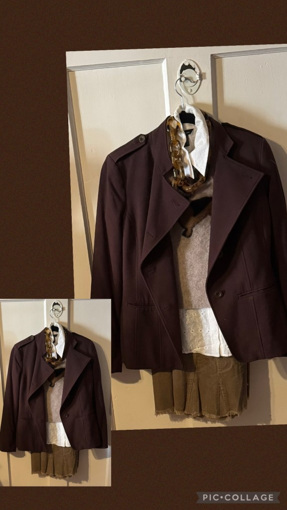 Brown Liz Claiborne blazer…(Goodwill on Crenshaw), Brown Philosophy cashmere dog sweater(Goodwill on Crenshaw), White eyelet butto-down (Thrift Store), Brown corduroy Katayone Adeli skirt (Sacks SFO), Brown necklace (T J Maxx)